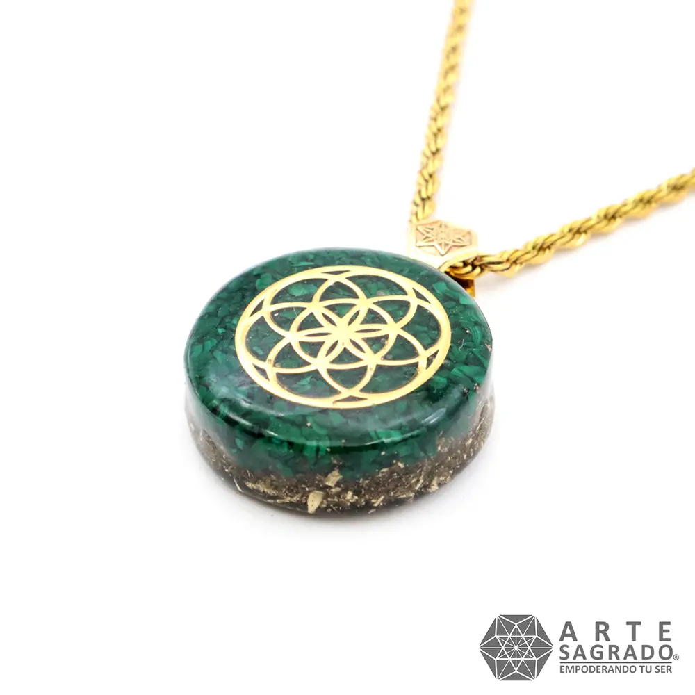 Micro Orgone Flower of Life Necklace in Gold Plate with Malachite