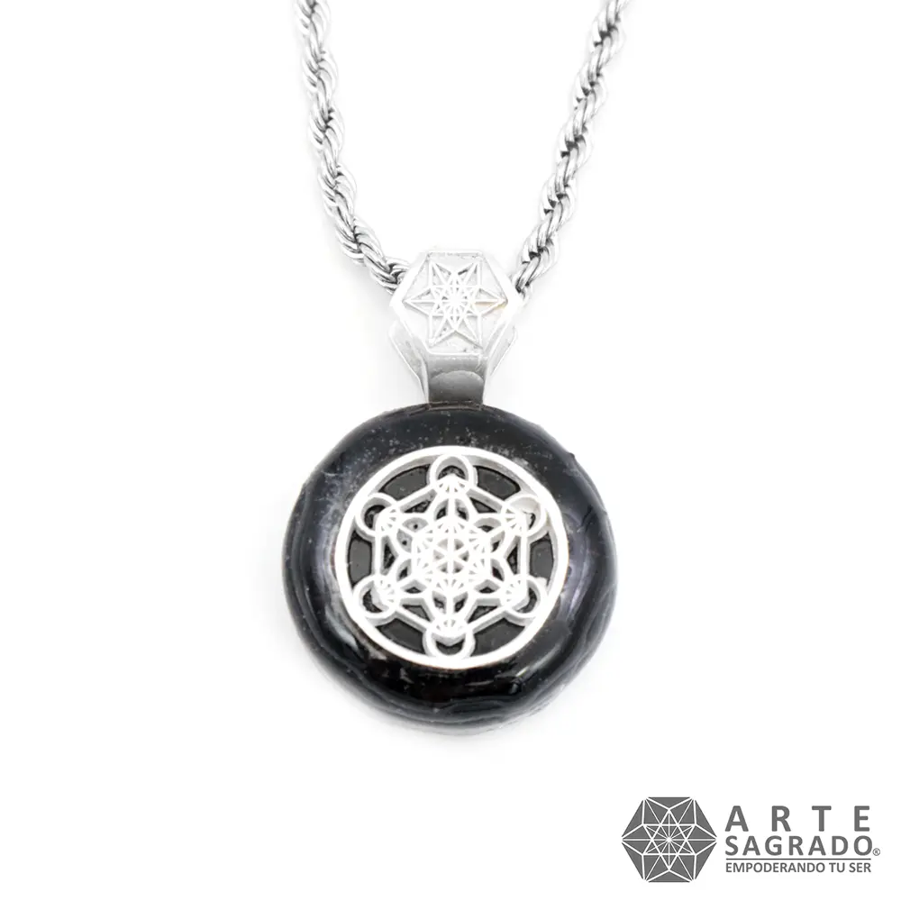 Collar de Cristales Orgón Cubo de Metatrón en Plata 0.925 con Shungita, Obsidiana y Turmalina Negra
